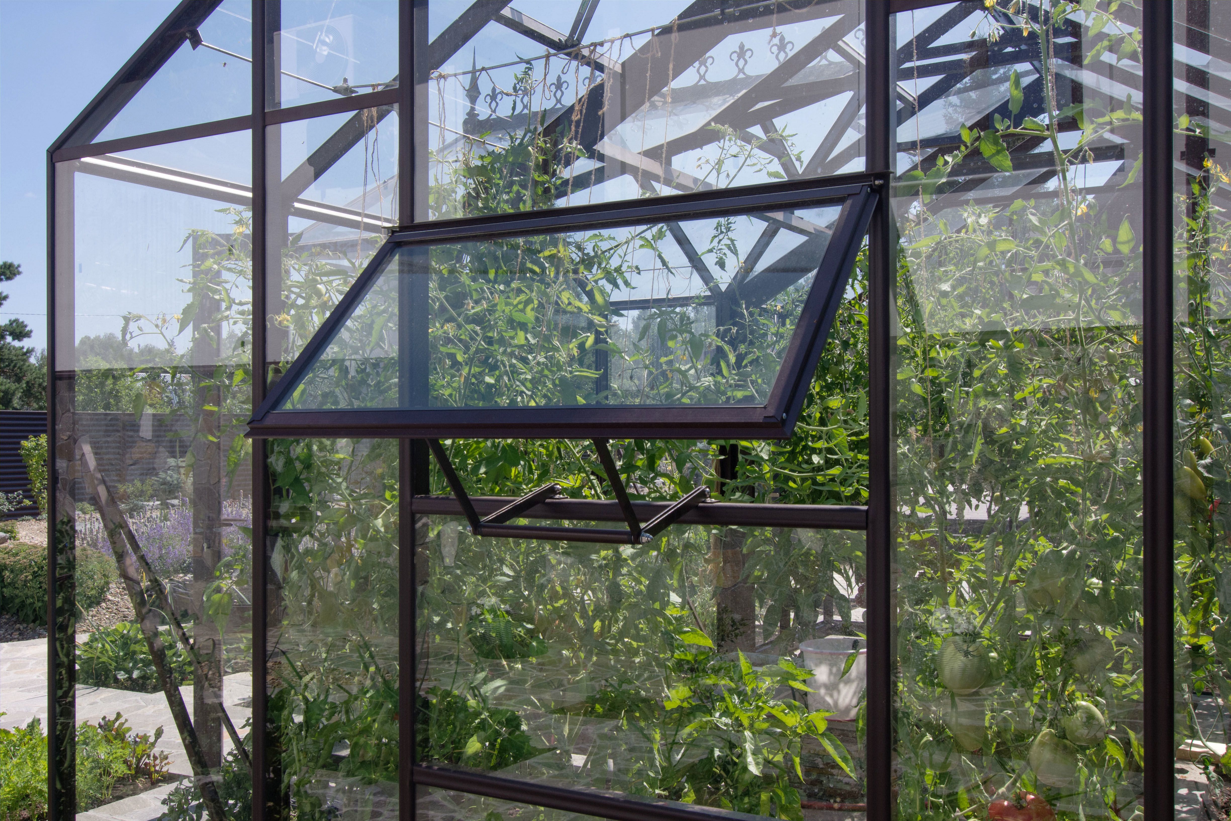 Длина теплицы - 6,6 м., в комплекте: дверь-купе, 2 торцевые форточки и 6 в скате крыши.